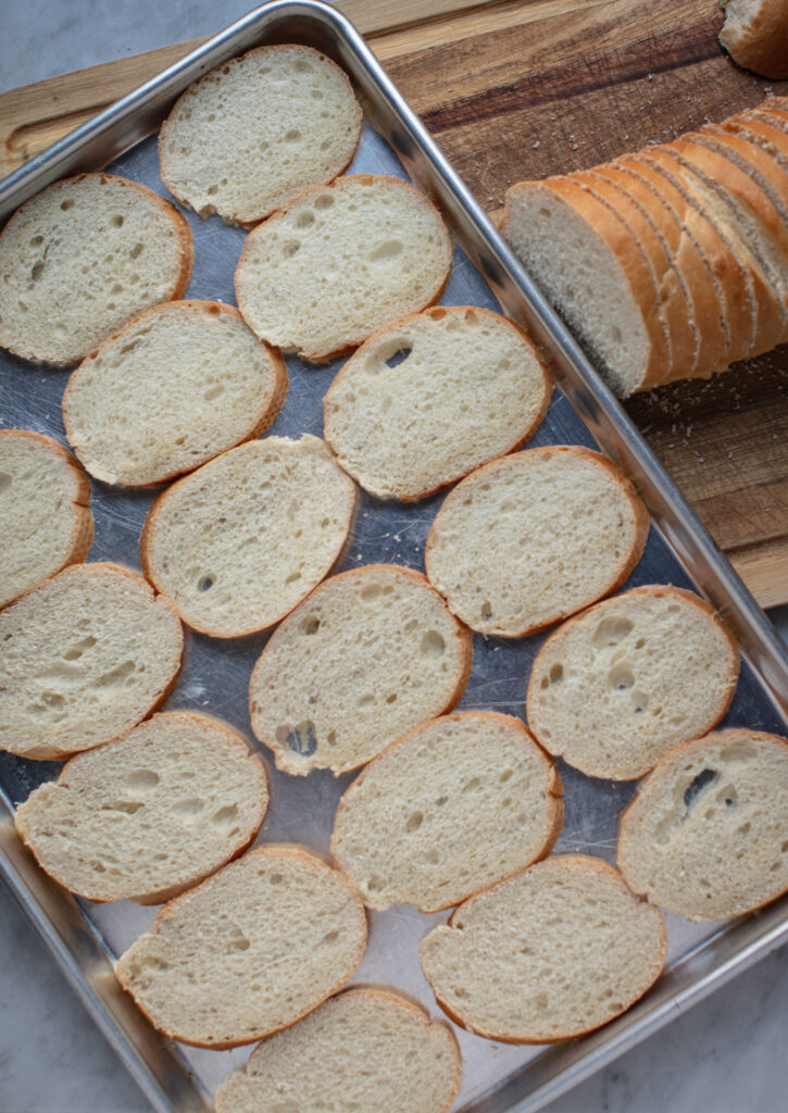 - Cut the French bread into slices about 1/4 inch thick. I prefer to cut it at an angle because I think it makes for prettier presentation.